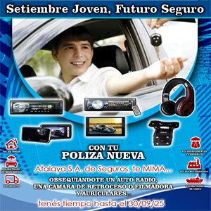EN ESTE MES DE LA JUVENTUD, ATALAYA S.A. DE SEGUROS TE SORPRENDE,con tu POLIZA NUEVA, te llevas sin SORTEOS un autoradio, camara filmadora o de retroceso, parlantes para tu vehículo y auriculares. No te pierdas de este increíble promoción. Atalaya S.A. de Seguros a tu lado siempre...Promoción válidahasta el 30-09-2025Apurate ¡Cupos limitados!Ingresa a www.atalayaseguros.com.py o al celular (0974) 40 20 20.-